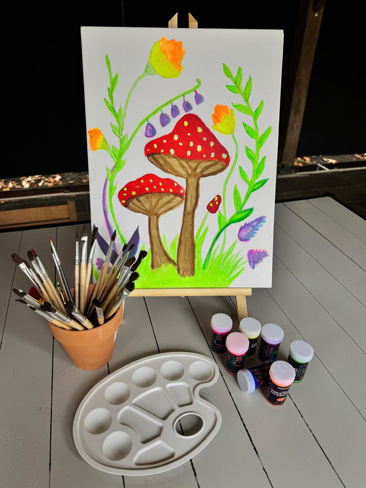 Laat je je creativiteit opbloeien terwijl je onder blacklight een botanisch kunstwerk schildert. Met fluorescerende verf, een vleugje magie en een gezellige sfeer wordt dit een onvergetelijke, kleurrijke ervaring.