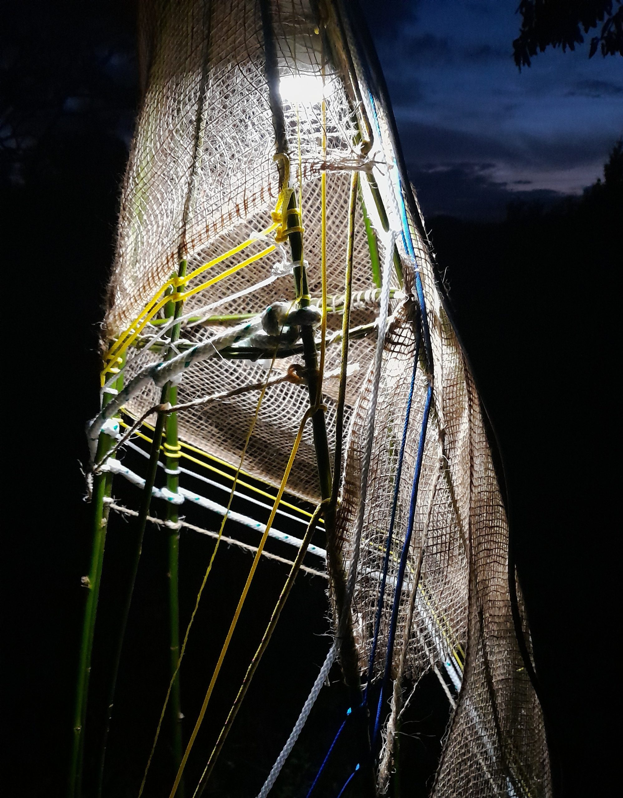 De ruimte onder de treurbeuk op Trompenburg is een mooie plek van geborgenheid. Bart Ensing benadrukt dit door lichtobjecten van natuurlijk materiaal én gekleurde draden op te hangen. Ze laten de hangende takken van de boom in al hun schoonheid zien en creëren een intieme, huiselijke sfeer. Een plek om even rustig te vertoeven en te verbinden met de boom, met de natuur.